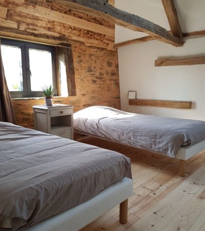 - L’hébergement en chambres partagées de 2 personnes, réparties sur 3 gîtes cosy (lits séparés; draps et serviettes de toilette fournis);